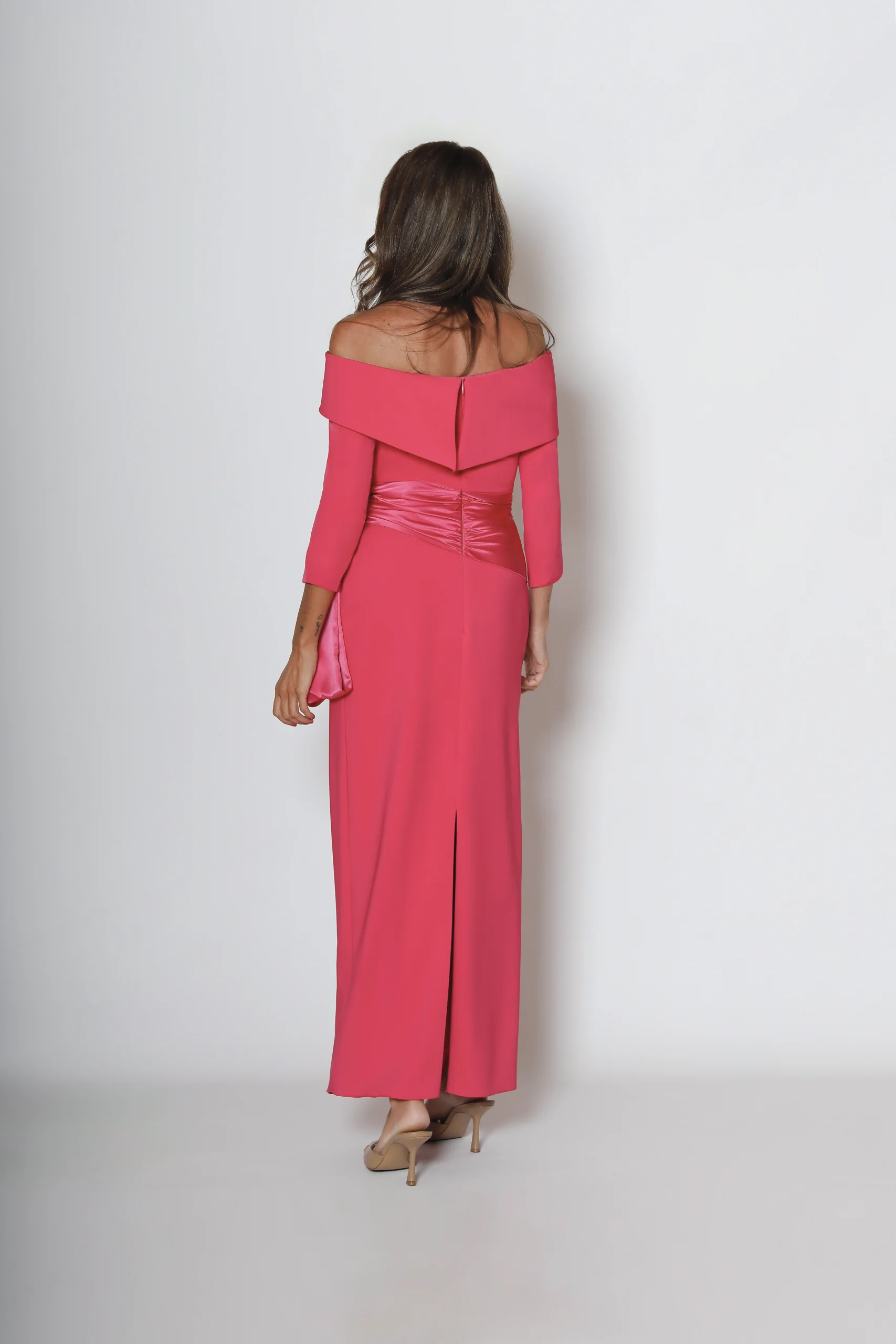 El protagonista es el fajín drapeado en satén, diseñado para definir la cintura y aportar un punto especial gracias a su volumen y su acabado luminoso. Un vestido perfecto para invitadas que buscan un look pulido, con personalidad y con ese efecto “wow” sin excesos.