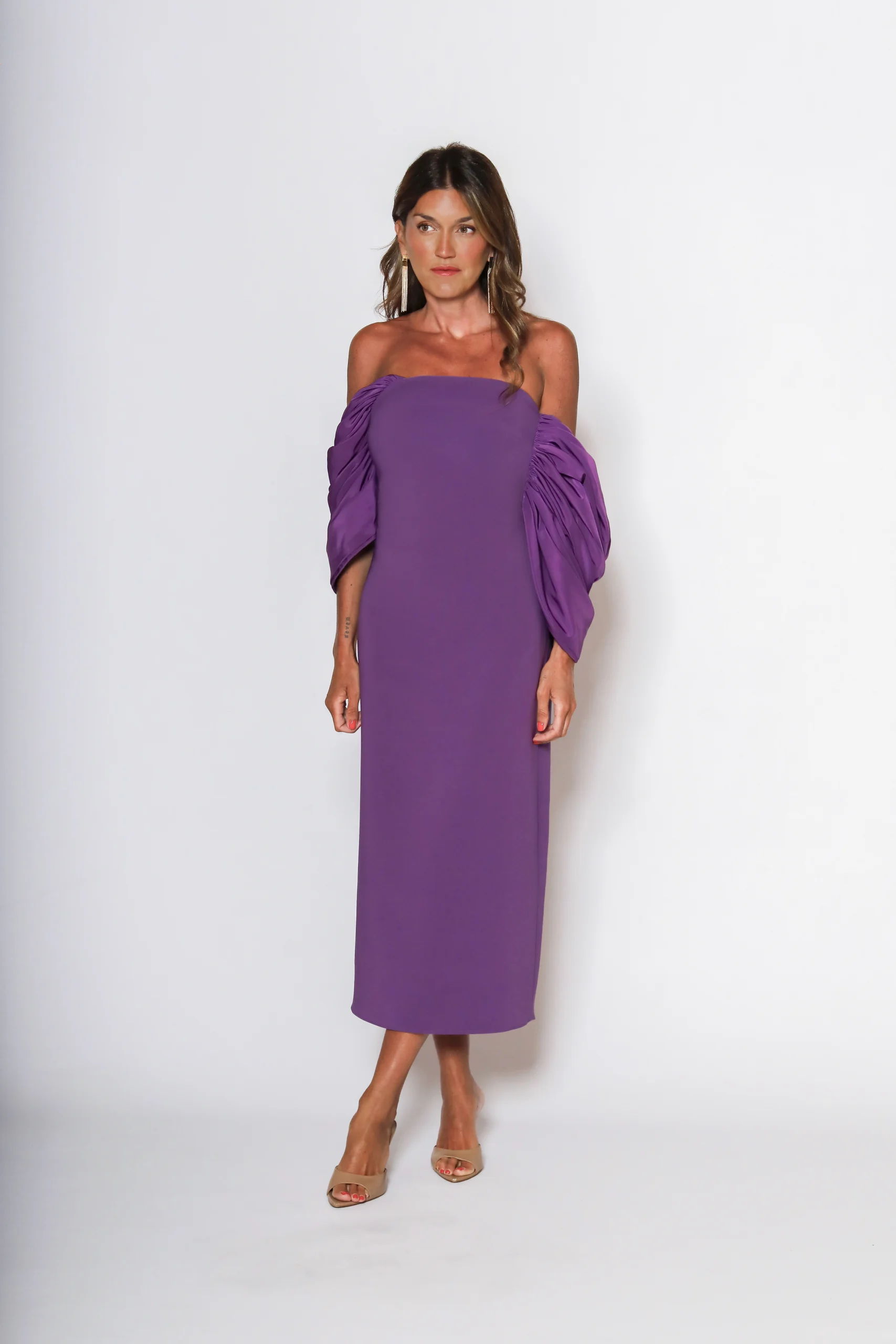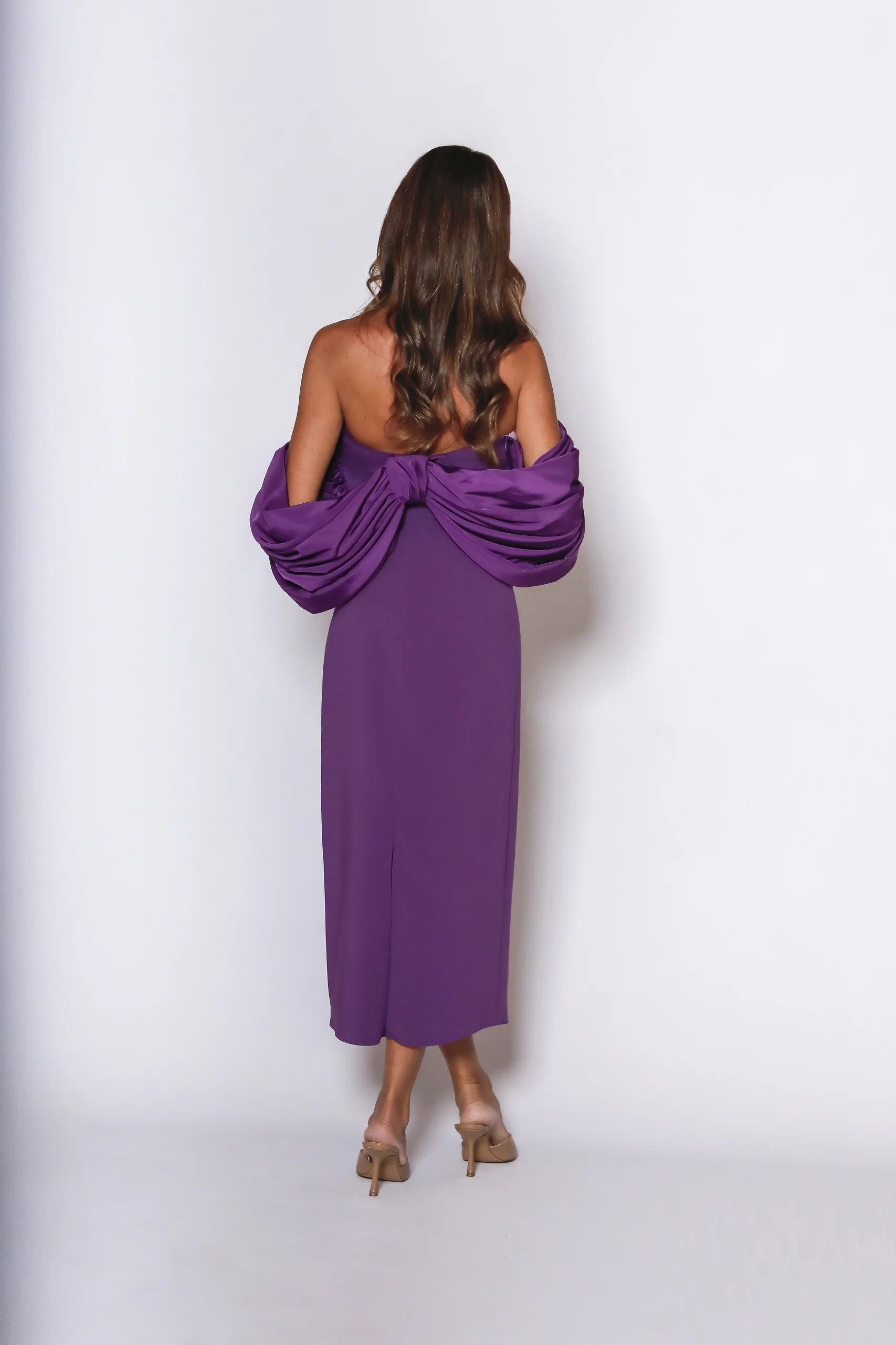 Minimalismo con un giro espectacular. Este vestido de invitada en crepe apuesta por una silueta recta y muy limpia, rematada con un escote palabra de honor que deja todo el protagonismo al diseño.