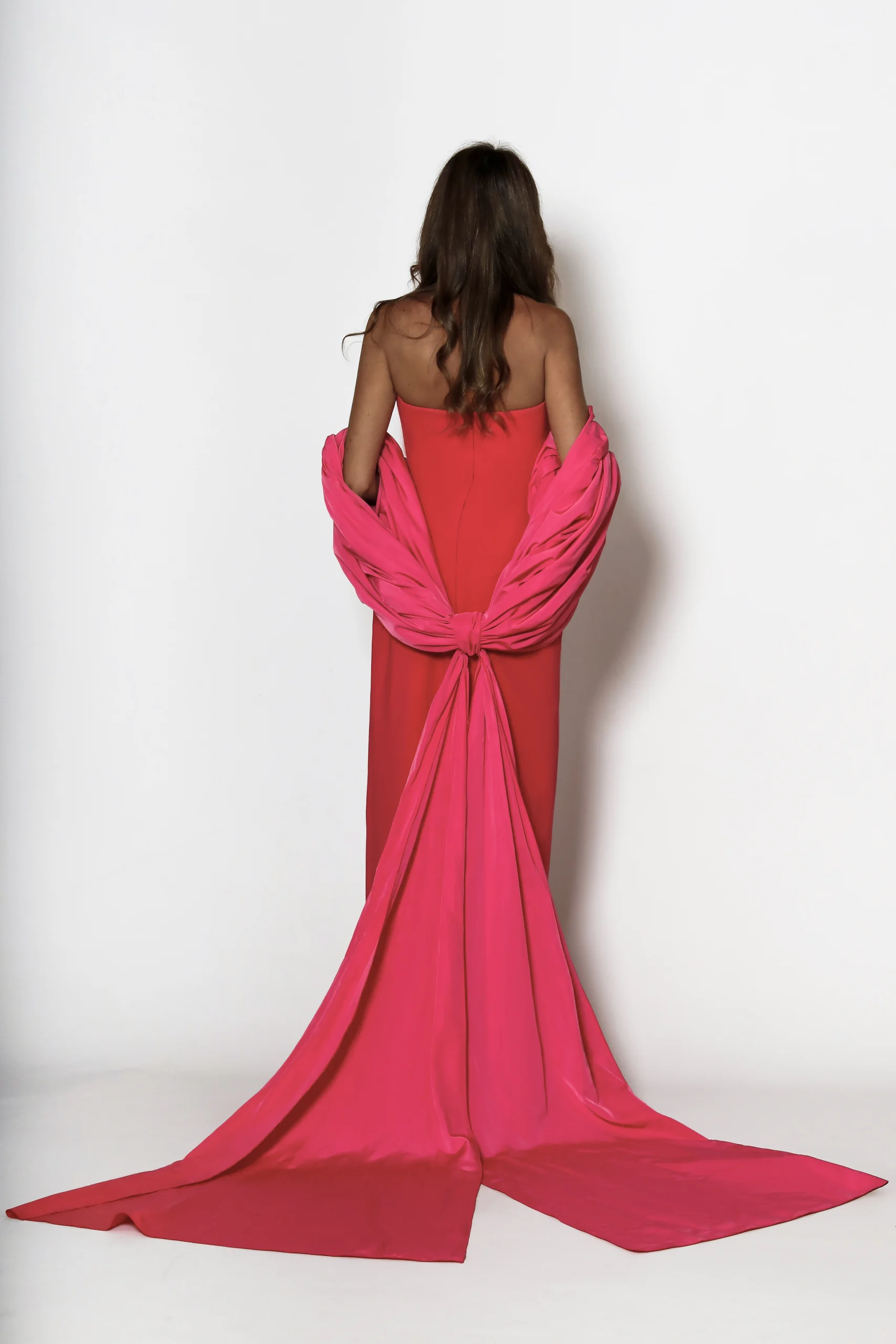 Limpio por delante, impactante por detrás. Este vestido de invitada en crepe apuesta por una silueta depurada y muy estilizada, con escote palabra de honor y una caída impecable que lo hace ultra favorecedor. El protagonista es el maxilazo de tafeta: volumen, textura y una cola ligera que añade movimiento y hace el look mucho más especial, sin recargar. Un vestido de fiesta moderno y con mucha presencia.