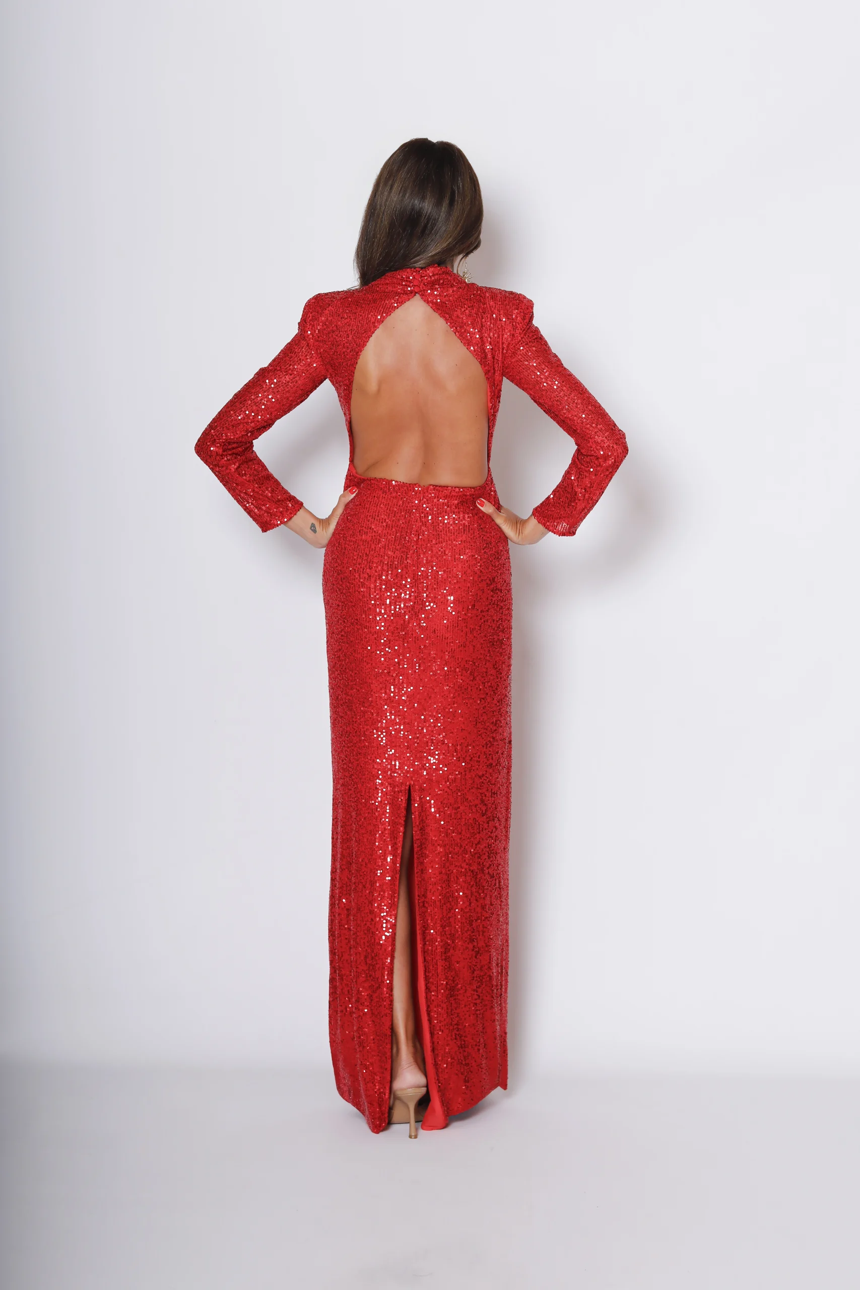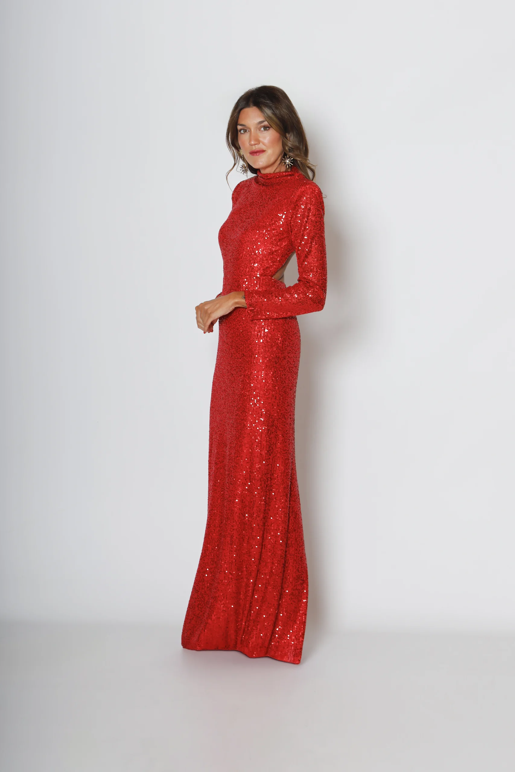 Brillo limpio y corte impecable. Este vestido de invitada largo en paillete apuesta por una silueta estilizada que cae recta, con cuello alto y manga larga para un efecto sofisticado y muy actual.