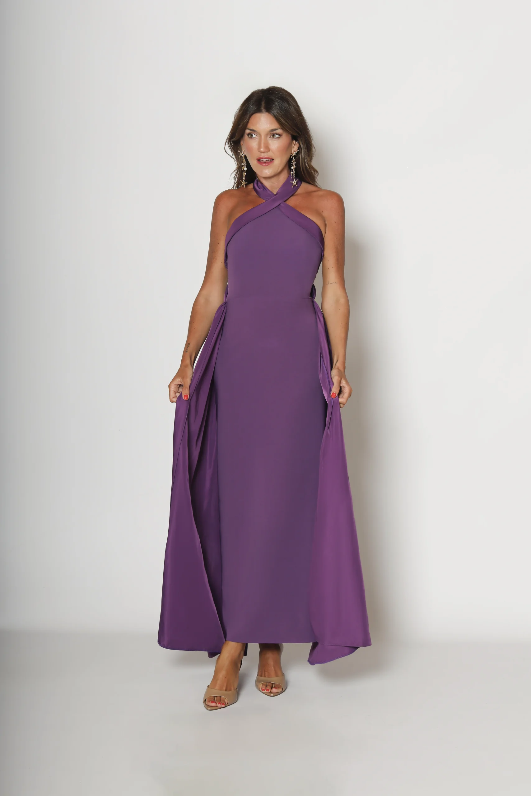 Líneas limpias con un giro muy especial. Este vestido de invitada en crepe apuesta por un escote cruzado que enmarca la parte superior y una silueta larga, pulida y muy favorecedora. Las caídas laterales en tafeta aportan volumen y movimiento, creando ese efecto “capa” ligero que eleva el diseño sin recargarlo. Un vestido de fiesta moderno, elegante y con mucha presencia.