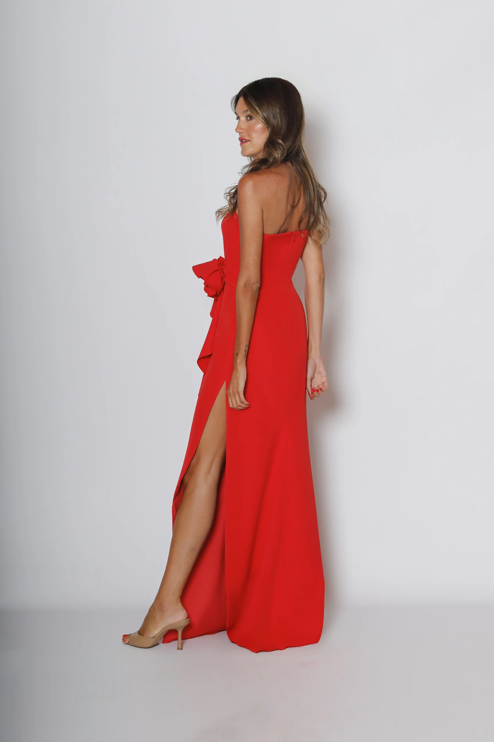 La abertura lateral aporta ligereza al caminar, mientras la cascada de volantes que nace en la cadera añade movimiento y un punto especial sin recargar el conjunto.