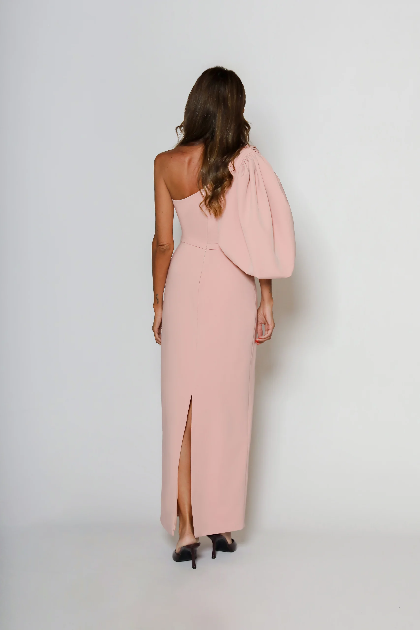 Corte impecable, presencia total. Este vestido de invitada en crepe apuesta por una silueta limpia y asimétrica, con maxi manga que aporta volumen y equilibra el diseño. El lacito en la cintura ajusta y define sin recargar, y la falda cae recta y pulida para un acabado elegante y actual.