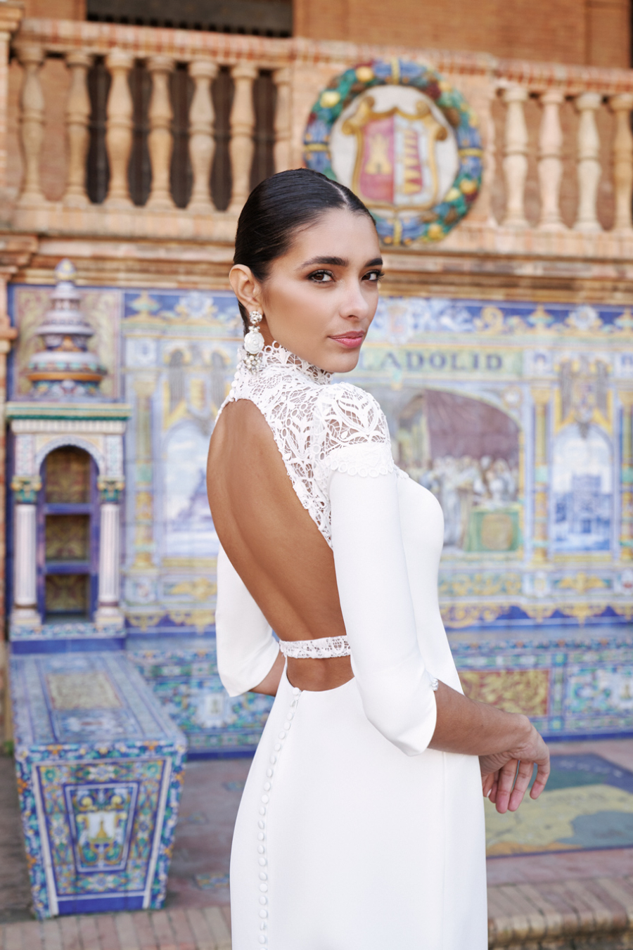 Robe de mariée et cape en crêpe, ornée d'une guipure exquise et d'une élégante encolure de cygne. Une fois la cape retirée, vous découvrirez un dos ouvert qui ajoute une touche de sensualité et de glamour, rehaussant encore l'impact de ce look de mariée.