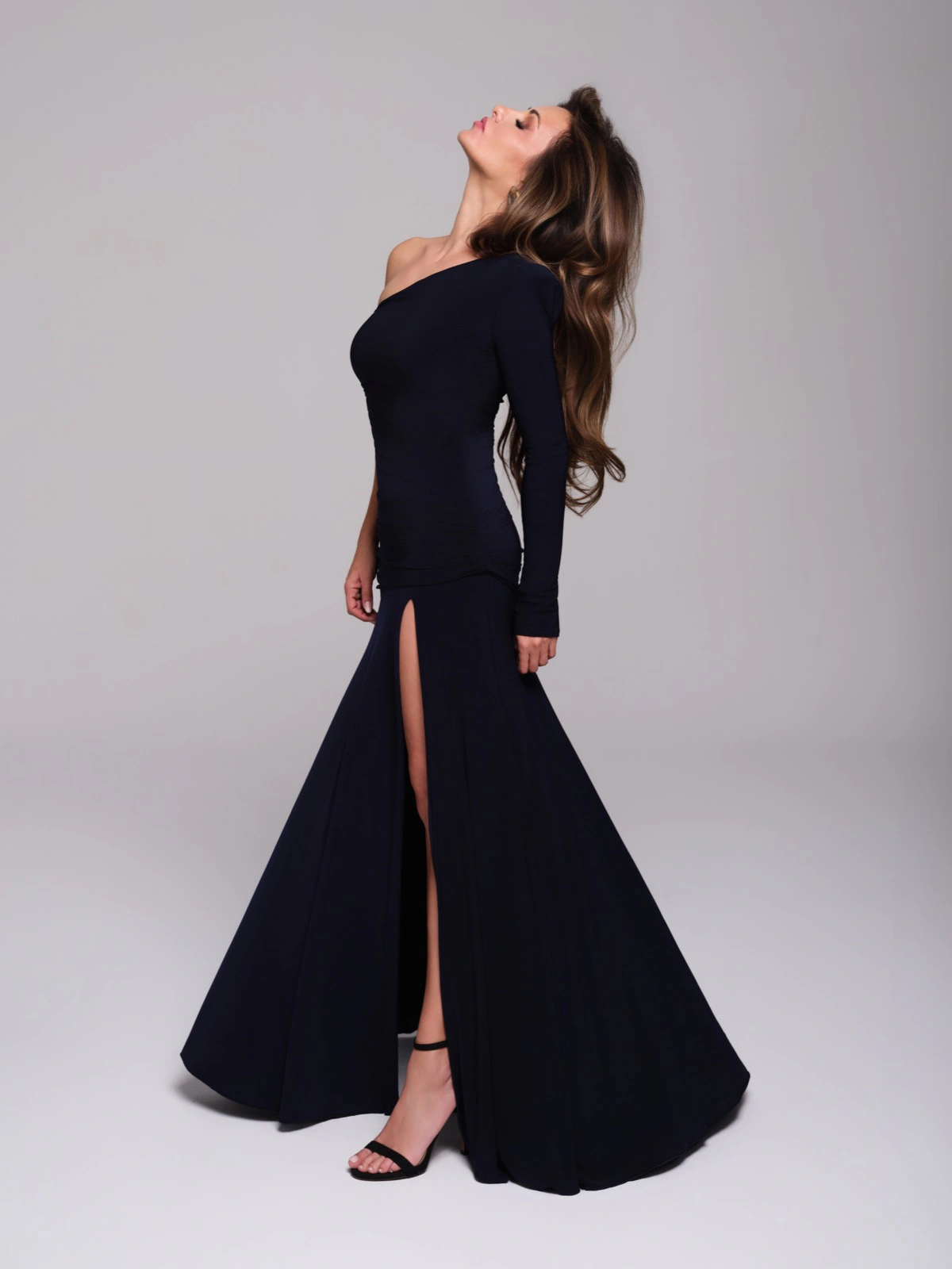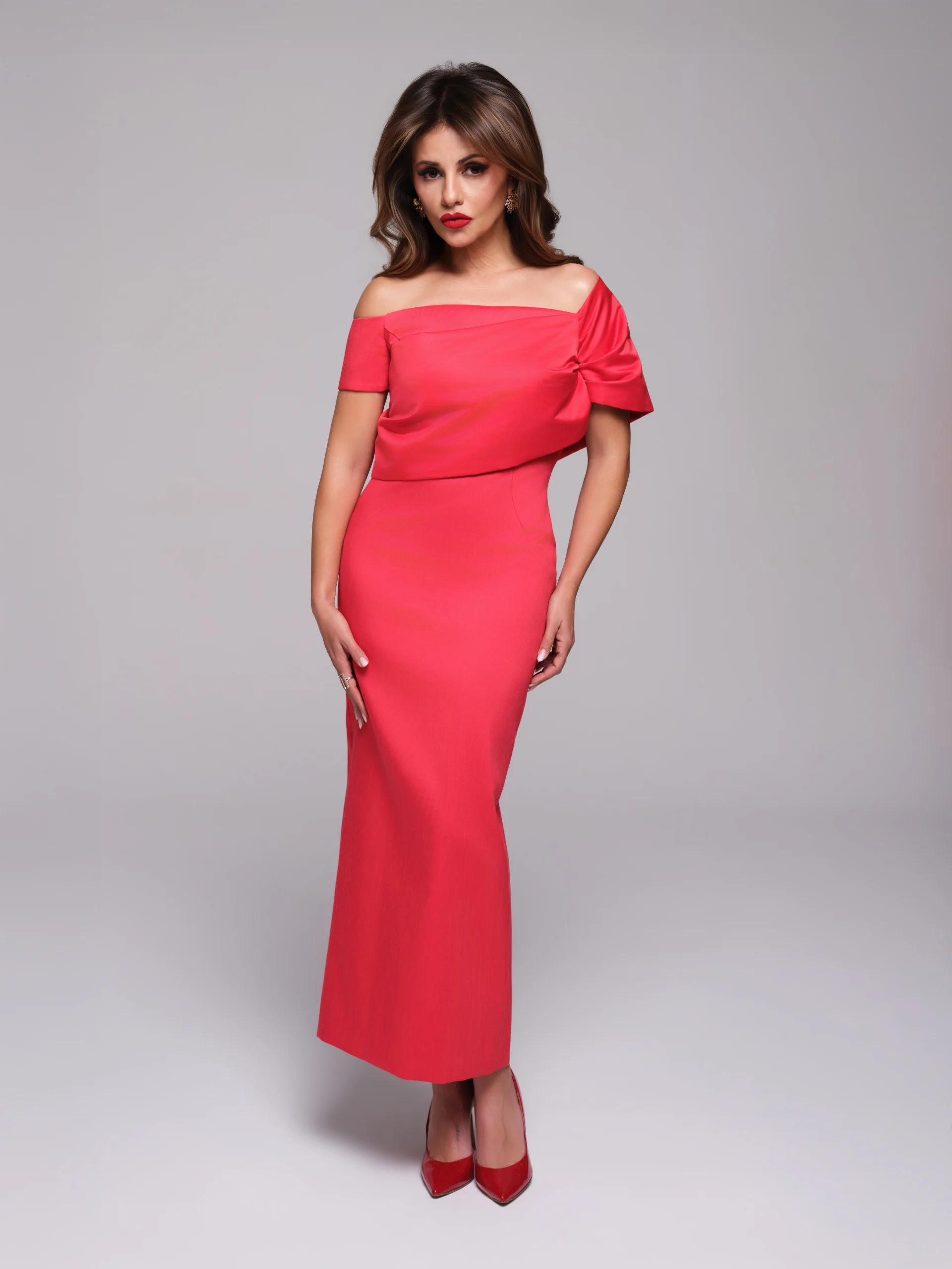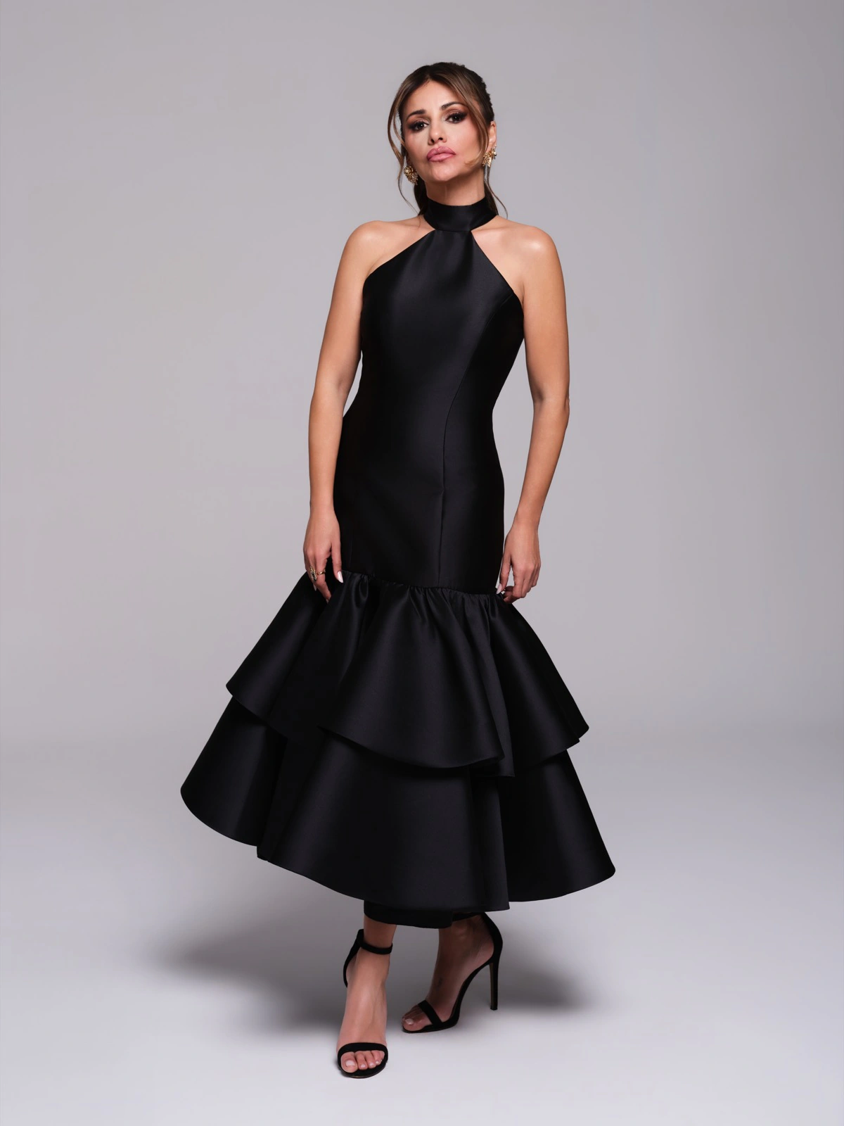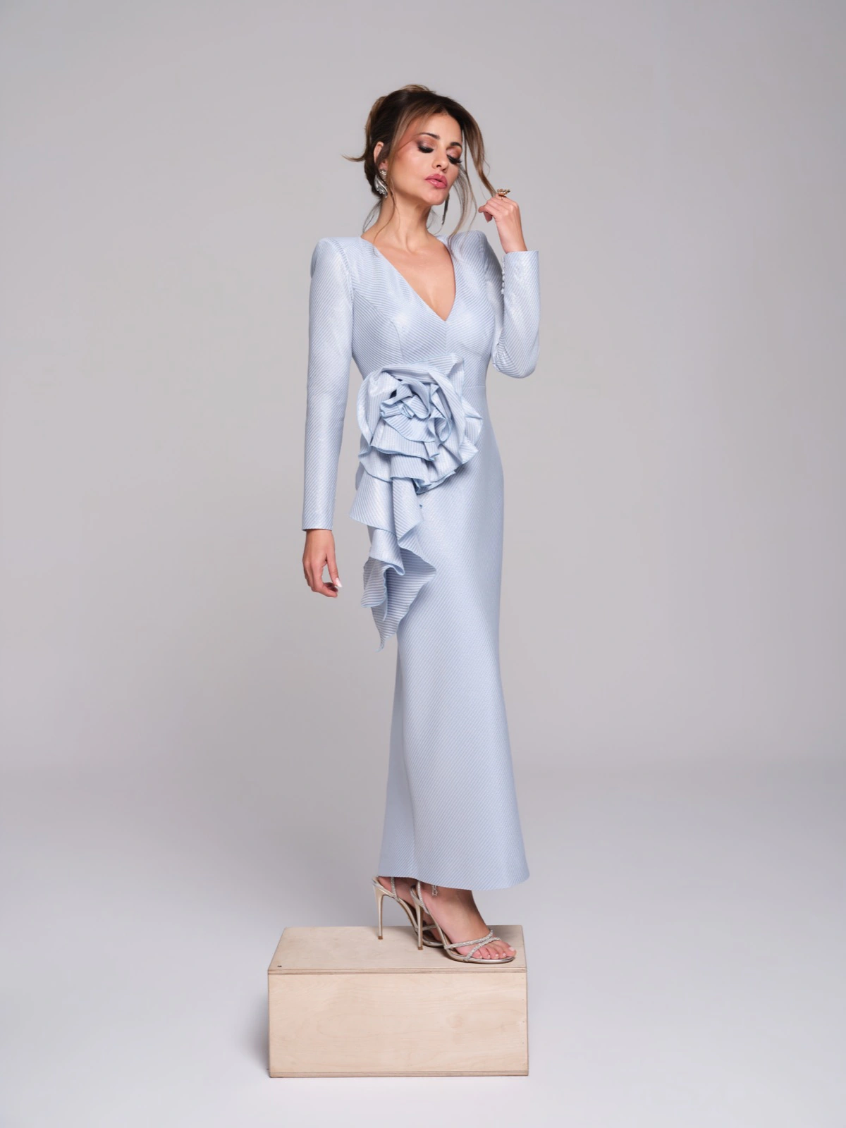 La cápsula reúne tejidos como mikado, crepé, tafeta, seda salvaje, tul bordado con paillette y encaje chantilly, trabajados con técnicas de drapeado, corsetería y bordado artesanal. Las siluetas combinan estructura y movimiento, con volúmenes precisos y detalles cuidadosamente ejecutados.