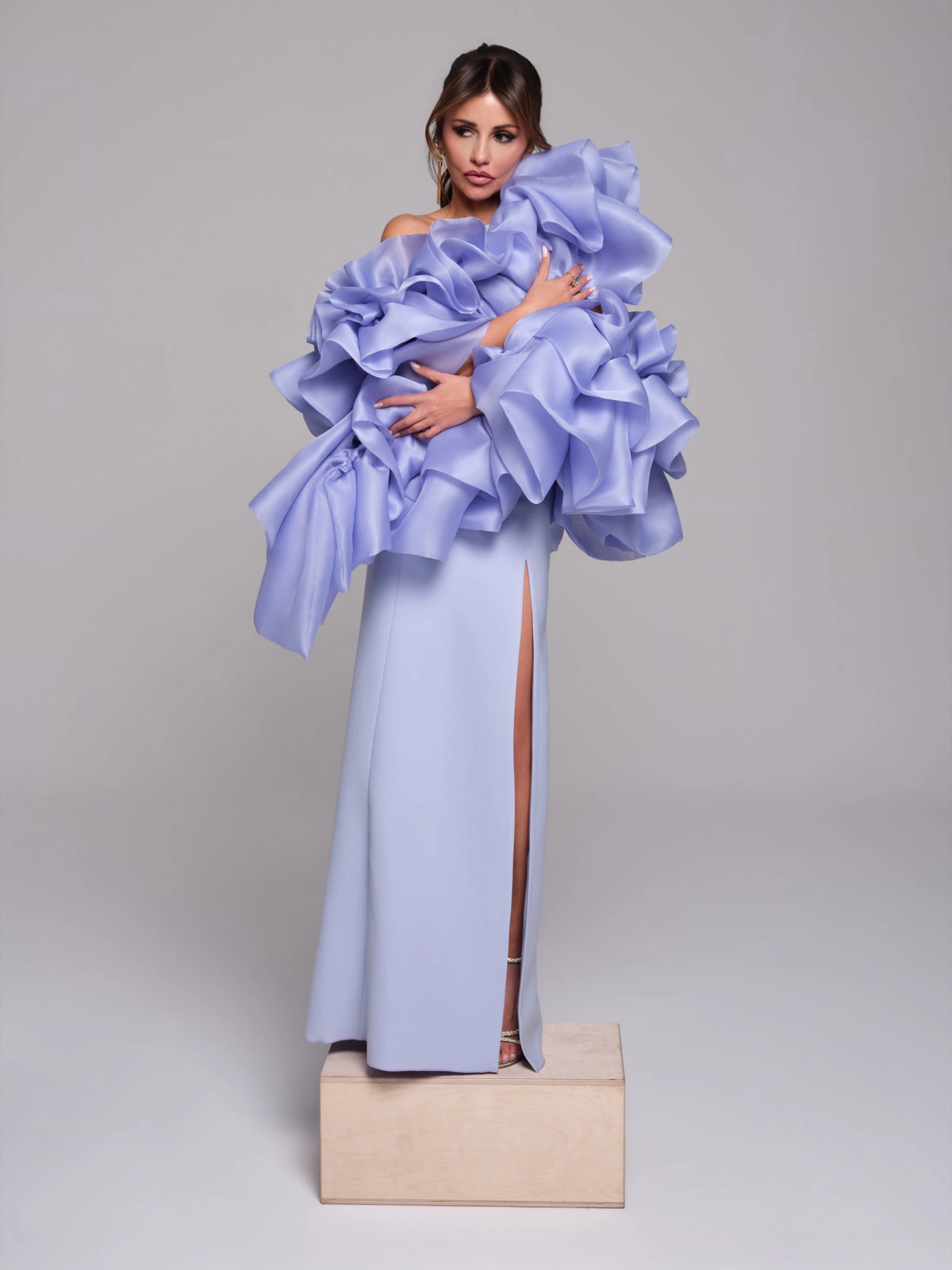Frida es un vestido palabra de honor en crepe, de silueta limpia y presencia rotunda. El diseño se transforma con una boa de organza de gran volumen, que envuelve el escote y aporta amplitud y un gesto muy escénico. El contraste entre la sobriedad del cuerpo y la fuerza de la organza define una estética potente y muy actual.