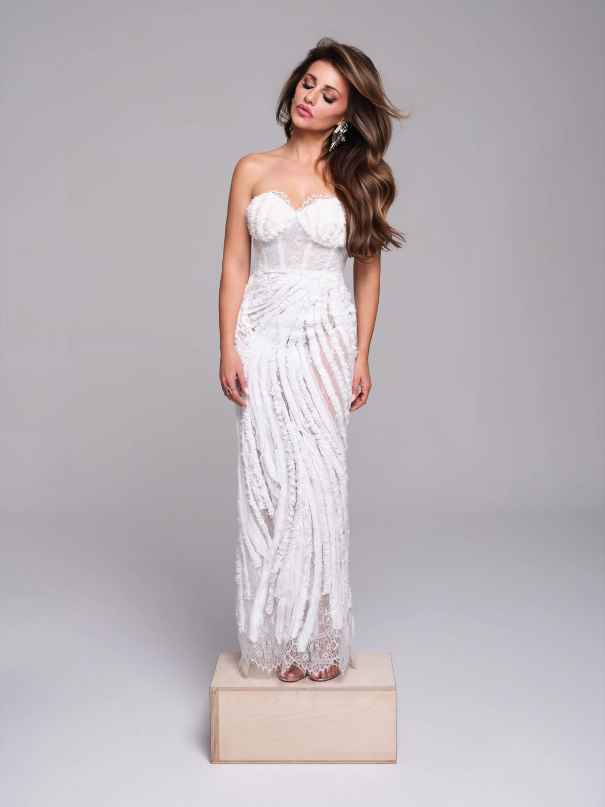 Melina destaca por su cuidada elaboración artesanal. El cuerpo corsé en encaje chantilly define la silueta con delicadeza, mientras la falda en chantilly bordado cae de forma fluida, dejando ver el dibujo del encaje en todo el largo. Una pieza ligera, elegante y llena de detalle.