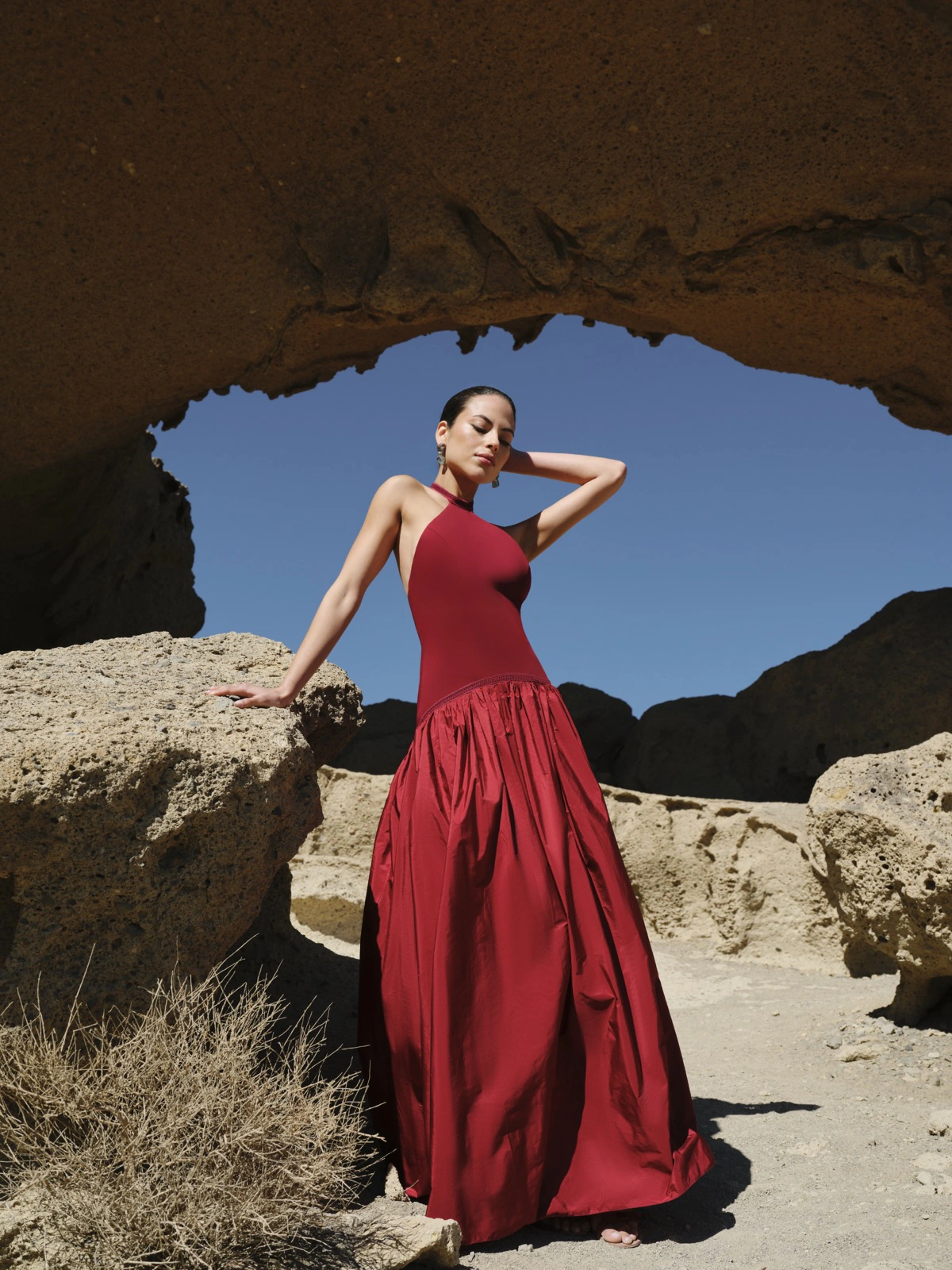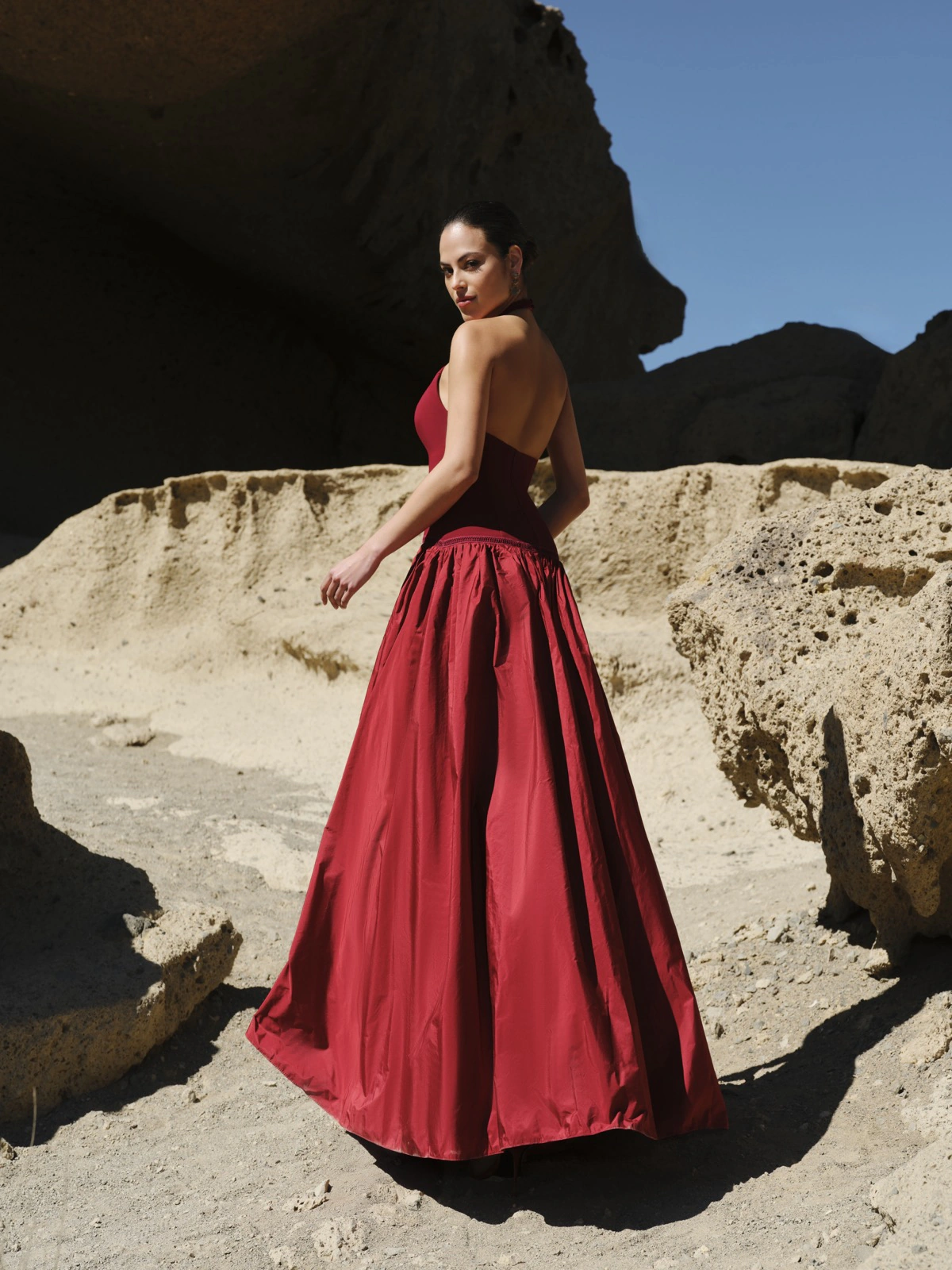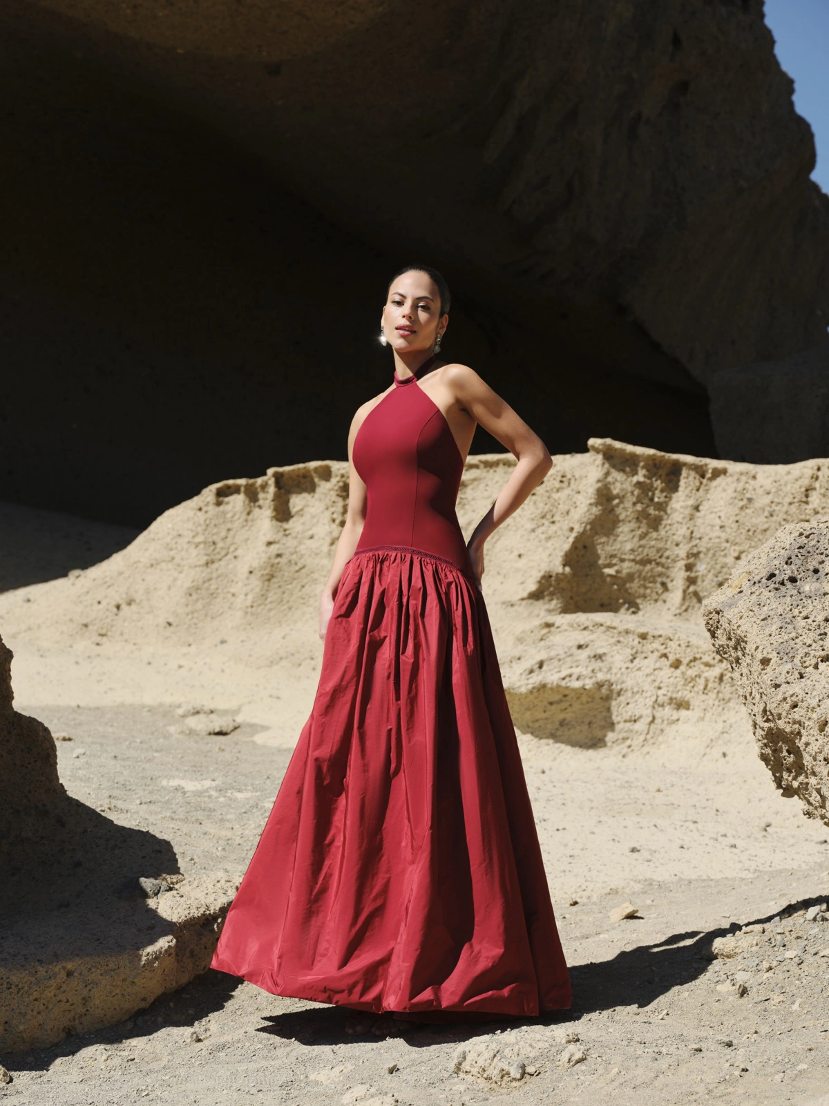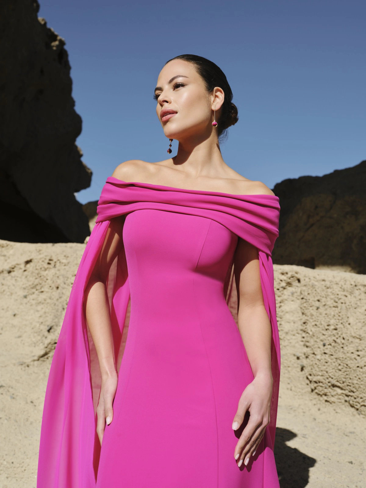 Este vestido de invitada irradia elegancia y feminidad en cada detalle. Confeccionado en crepe, su diseño destaca por el escote bardot que realza los hombros con sofisticación y una capa de gasa vaporosa que cae con fluidez desde la espalda, aportando movimiento y un efecto envolvente espectacular. Su silueta estiliza la figura con equilibrio y armonía. Ideal si lo que buscas es un vestido de fiesta elegante y distintivo. La combinación del crepe con la gasa crea un contraste sutil que transmite ligereza, fuerza y elegancia atemporal.