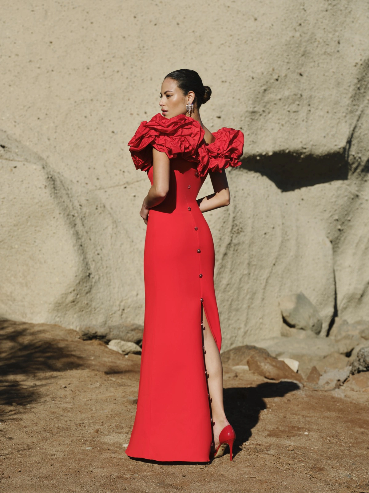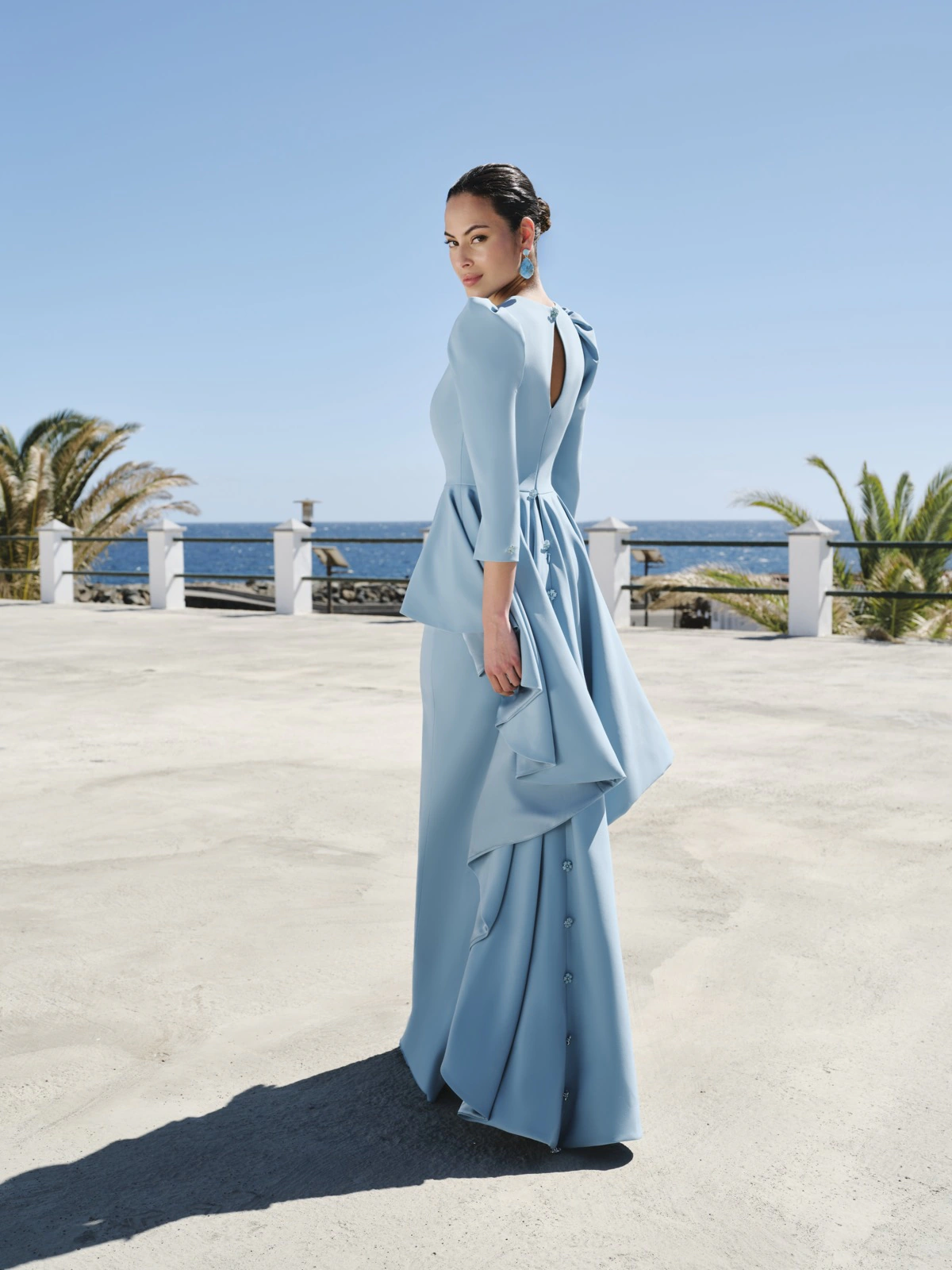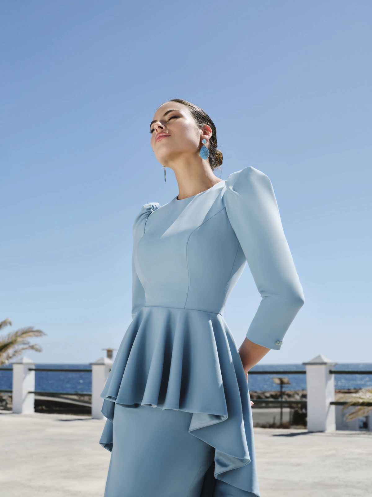 Nogal es un vestido de fiesta que combina la elegancia del crepe con el brillo sofisticado de los pailletes. Su cuerpo estructurado con escote en pico y mangas francesas estiliza la figura, mientras que la falda de lentejuelas aporta un efecto luminoso y lleno de movimiento. Las hombreras marcadas completan un diseño que resalta la silueta con fuerza y modernidad. Este vestido es una elección perfecta para quienes buscan un vestido de fiesta con personalidad, en el que el equilibrio entre lo clásico y lo contemporáneo se convierte en pura sofisticación.