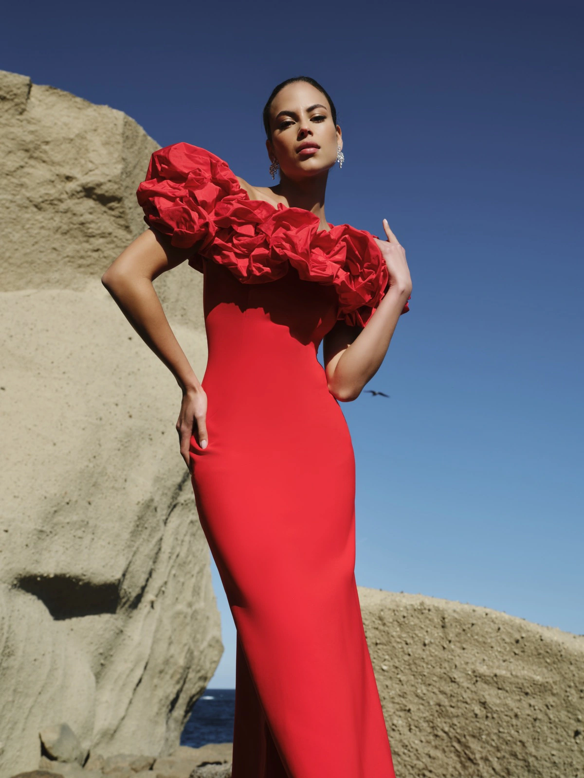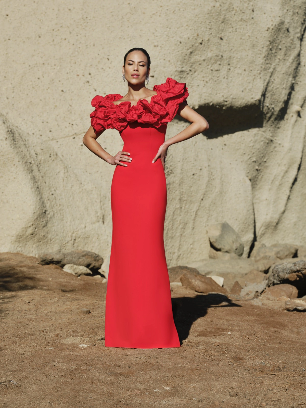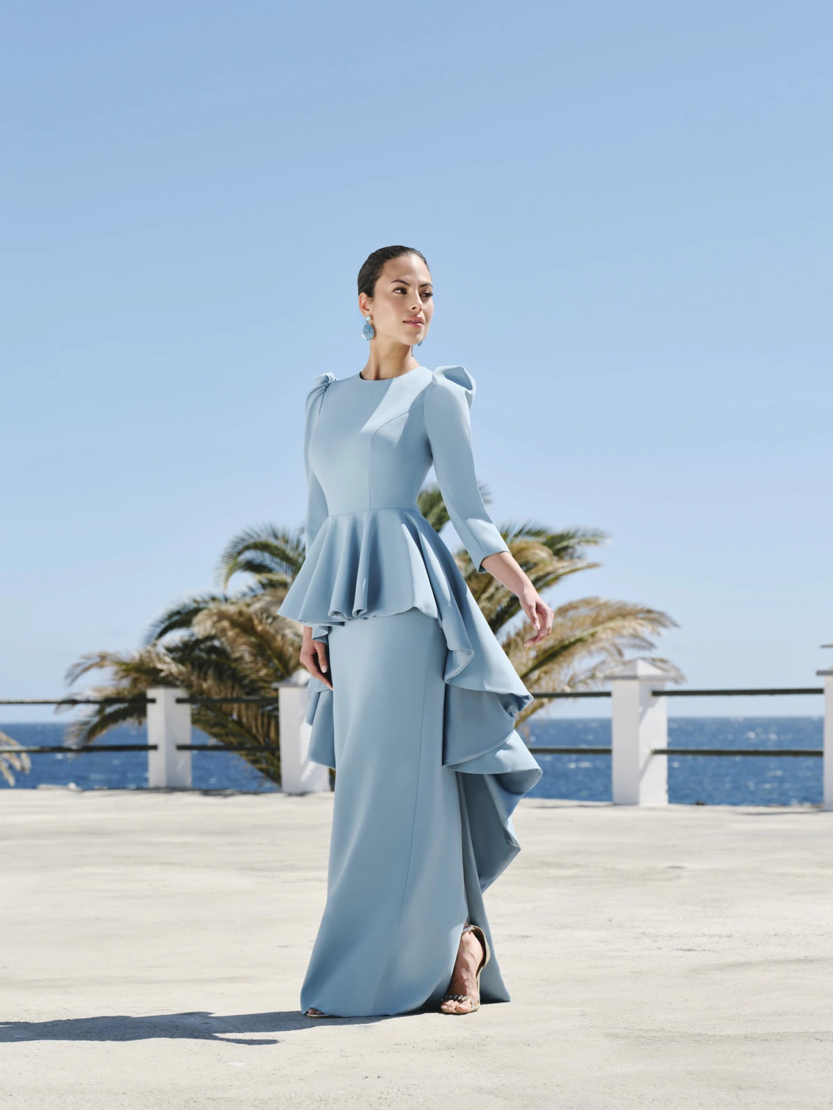 Nogal es un vestido de fiesta que combina la elegancia del crepe con el brillo sofisticado de los pailletes. Su cuerpo estructurado con escote en pico y mangas francesas estiliza la figura, mientras que la falda de lentejuelas aporta un efecto luminoso y lleno de movimiento. Las hombreras marcadas completan un diseño que resalta la silueta con fuerza y modernidad. Este vestido es una elección perfecta para quienes buscan un vestido de fiesta con personalidad, en el que el equilibrio entre lo clásico y lo contemporáneo se convierte en pura sofisticación.