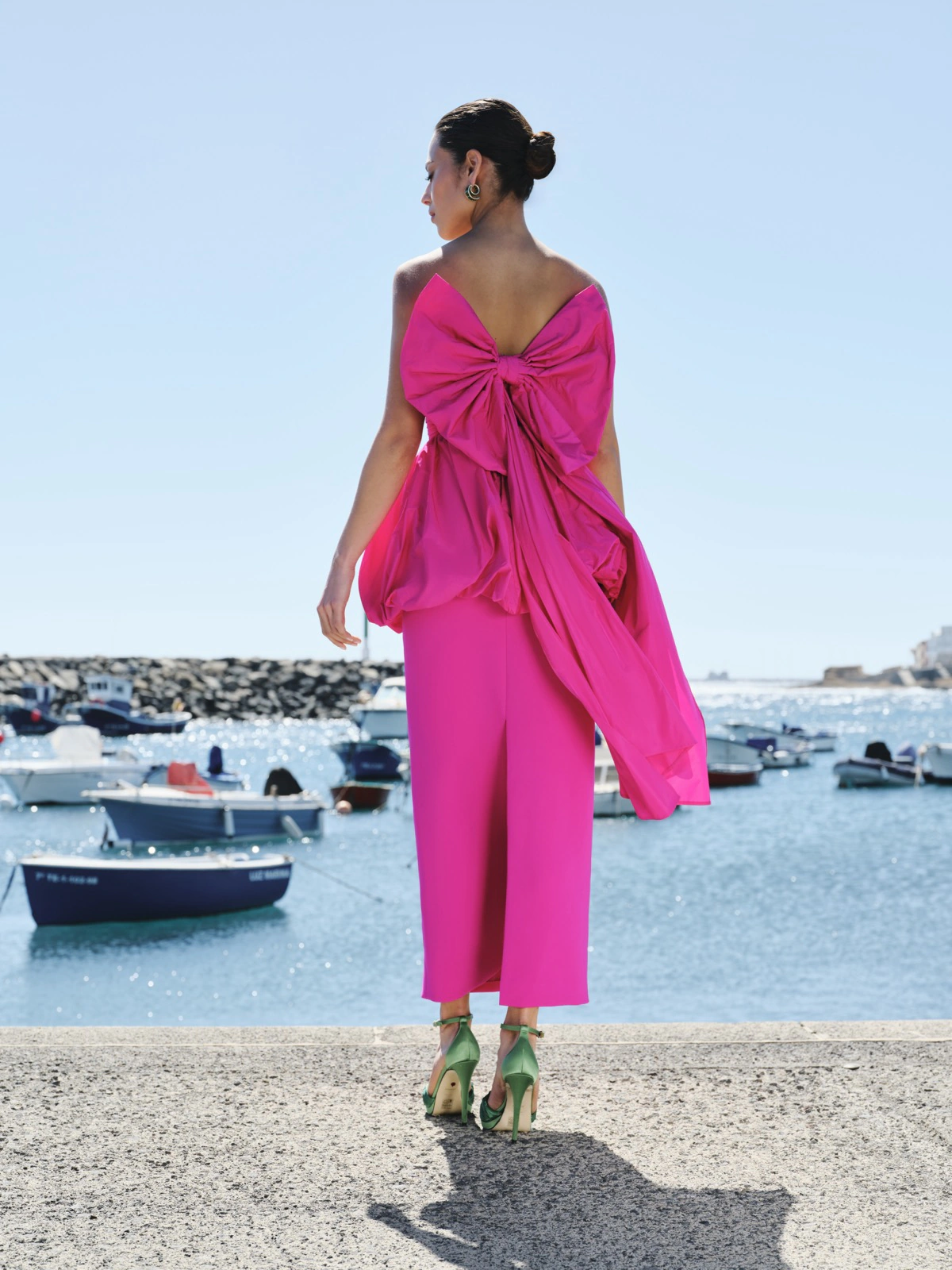 Por la parte trasera, el diseño incluye un escote en forma de V que añade un toque de modernidad y realza la figura. La falda de crepe, destaca por su caída fluida y natural. Este vestido fusiona calidad artesanal con sofisticación, convirtiéndose en una opción única.