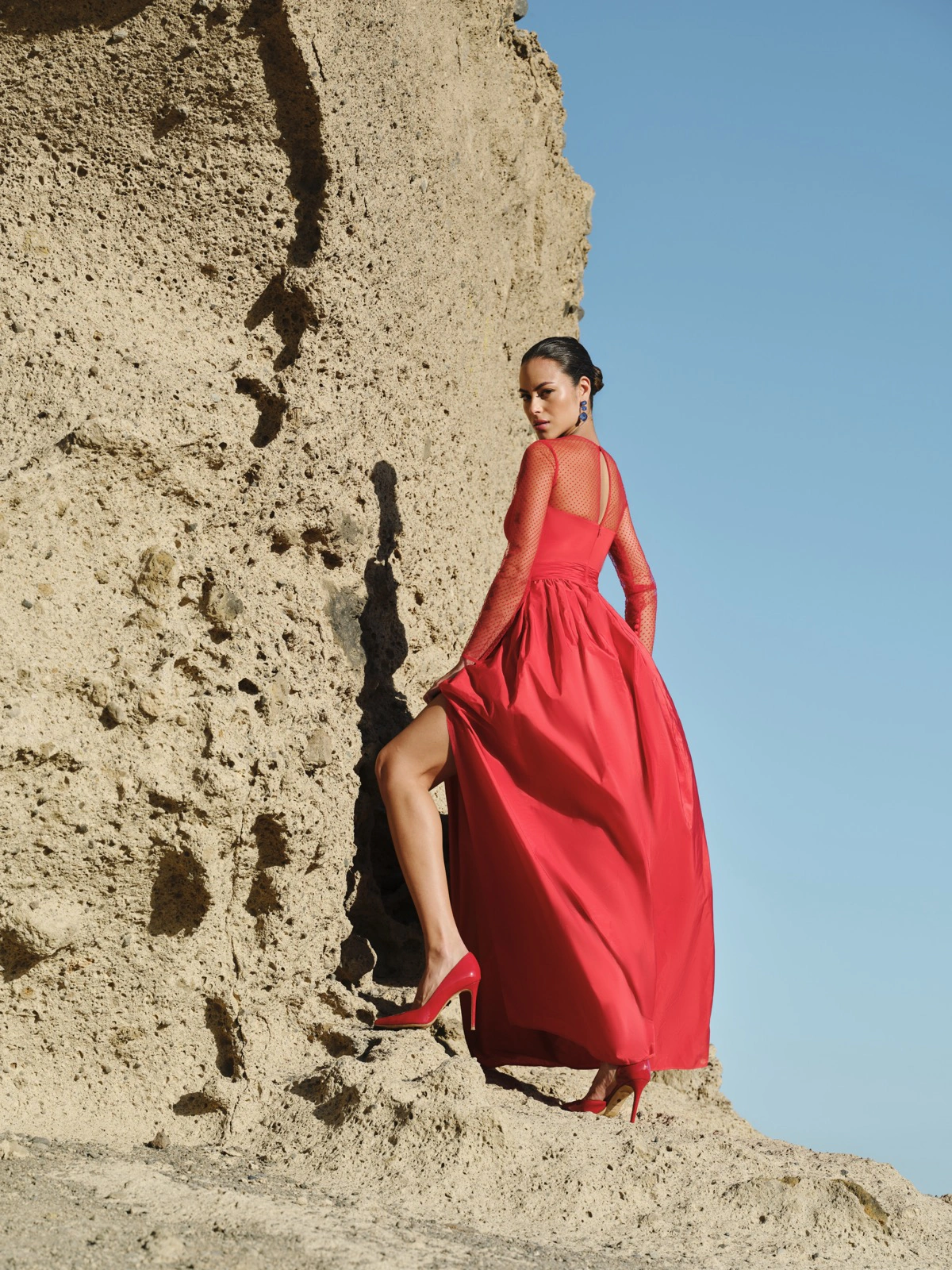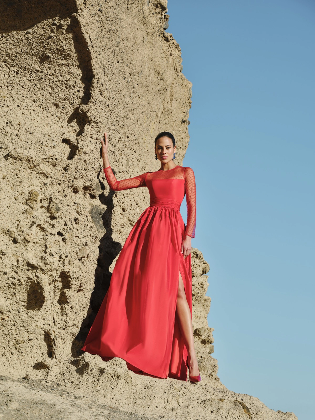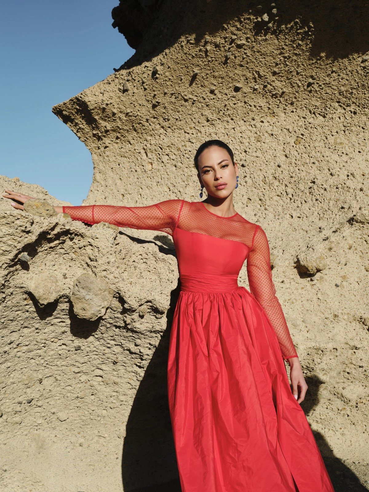 Vestido con cuerpo entallado en crepe, que realza la silueta, combinado con una falda midi de tul flocado que aporta movimiento y romanticismo. La confección del tul añade textura y volumen al vestido, creando una pieza elegante y moderna.